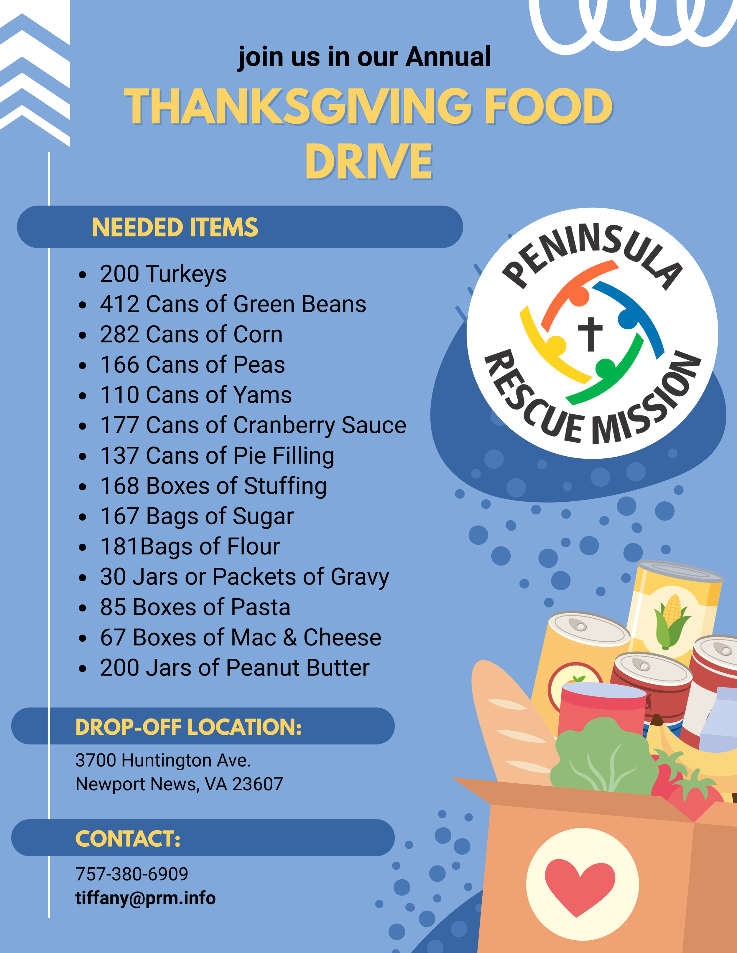 At the Peninsula Rescue Mission (PRM), Thanksgiving is about sharing the love of Christ in a very practical way. With donor support, PRM assembles 175-200 food boxes for families in need within our community. Schools and churches help deliver these boxes to families. Each box contains everything needed for a delicious Thanksgiving meal.
